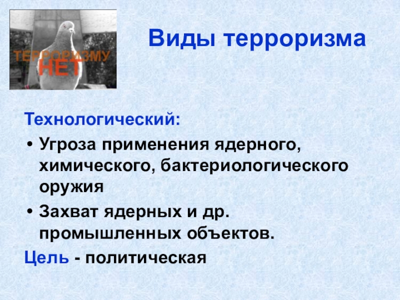 Виды терроризмаТехнологический:Угроза применения ядерного, химического, бактериологического оружияЗахват ядерных и др. промышленных объектов.Цель - политическая