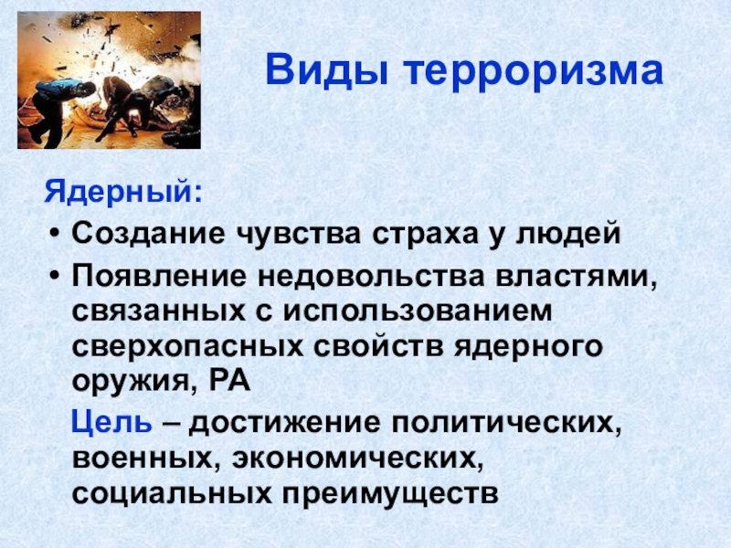 Виды терроризмаЯдерный:Создание чувства страха у людейПоявление недовольства властями, связанных с использованием сверхопасных свойств ядерного оружия, РА