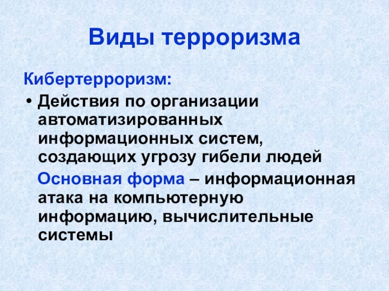 Виды терроризмаКибертерроризм:Действия по организации автоматизированных информационных систем, создающих угрозу гибели людей  Основная форма – информационная атака