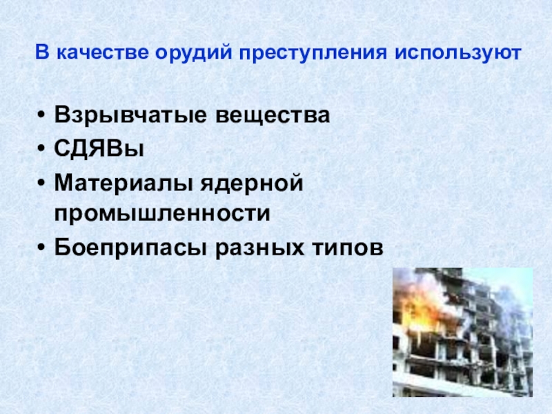 В качестве орудий преступления используютВзрывчатые веществаСДЯВыМатериалы ядерной промышленностиБоеприпасы разных типов