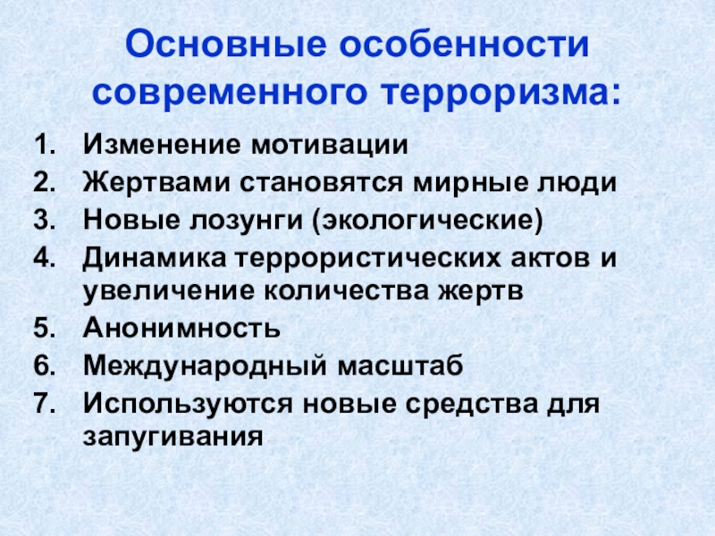 Основные особенности современного терроризма:Изменение мотивацииЖертвами становятся мирные людиНовые лозунги (экологические)Динамика террористических актов и увеличение количества жертвАнонимностьМеждународный масштабИспользуются