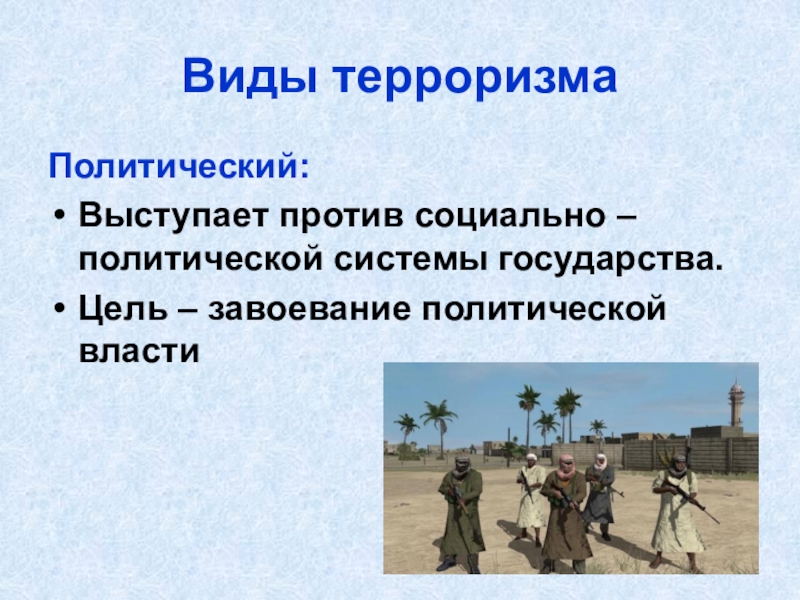 Виды терроризмаПолитический:Выступает против социально – политической системы государства.Цель – завоевание политической власти