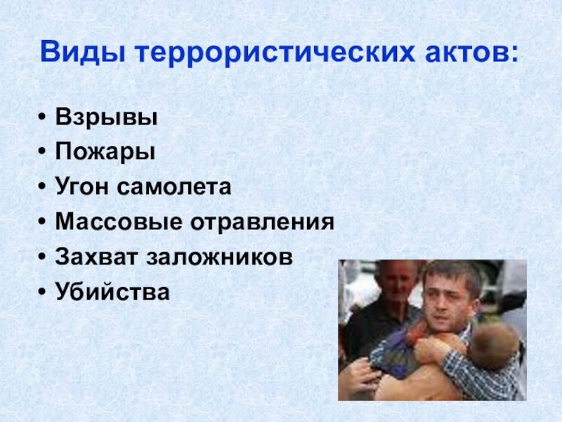Виды террористических актов:ВзрывыПожарыУгон самолетаМассовые отравленияЗахват заложниковУбийства