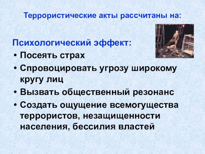 Террористические акты рассчитаны на:Психологический эффект:Посеять страхСпровоцировать угрозу широкому кругу лицВызвать общественный резонансСоздать ощущение всемогущества террористов, незащищенности населения, бессилия властей