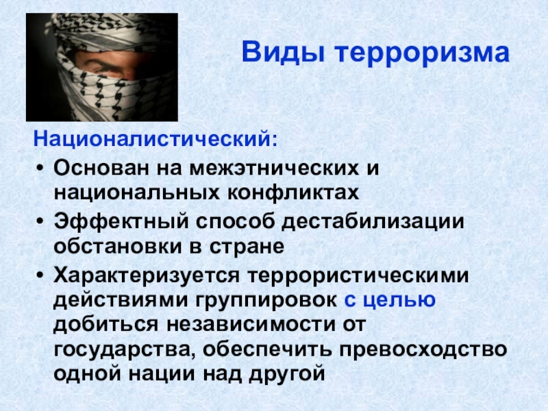 Виды терроризмаНационалистический:Основан на межэтнических и национальных конфликтахЭффектный способ дестабилизации обстановки в странеХарактеризуется террористическими действиями группировок с целью