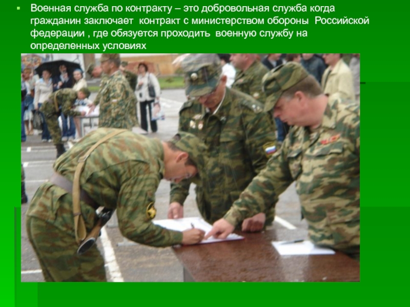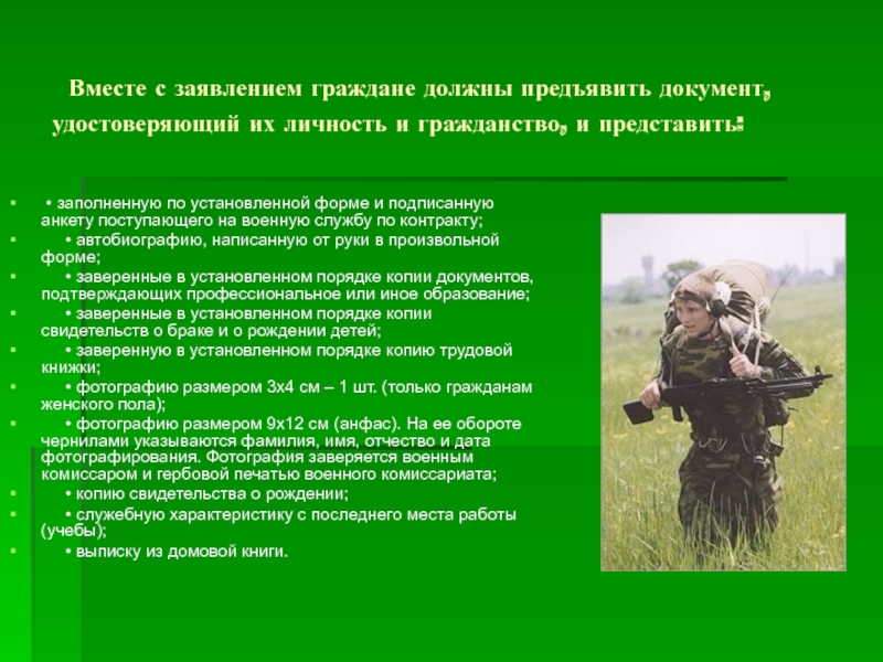 • заполненную по установленной форме и подписанную анкету поступающего на военную службу по контракту;