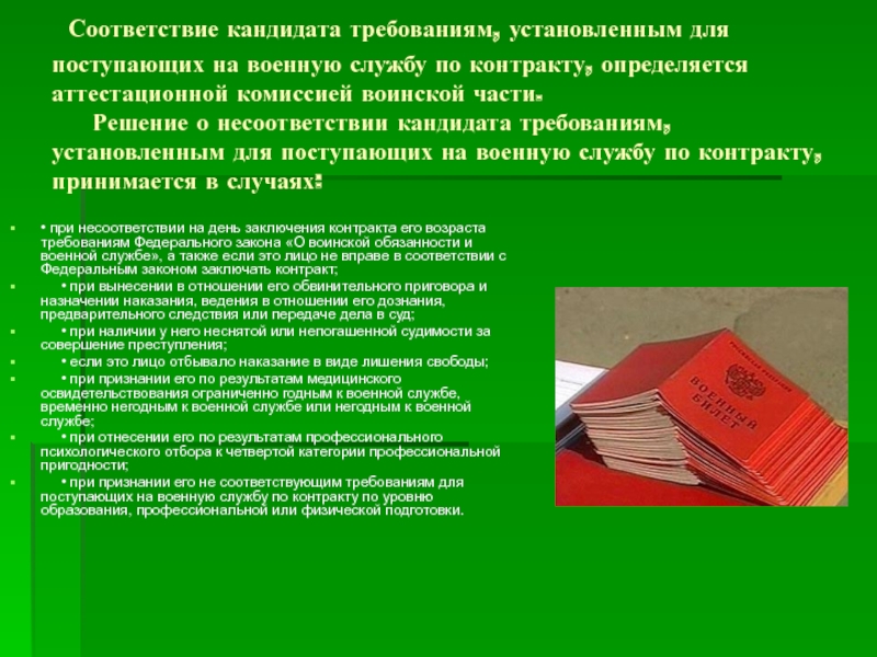 при несоответствии на день заключения контракта его возраста требованиям Федерального закона «О воинской обязанности и военной службе», а также если это лицо не вправе в соответствии с Федеральным законом заключать контракт;