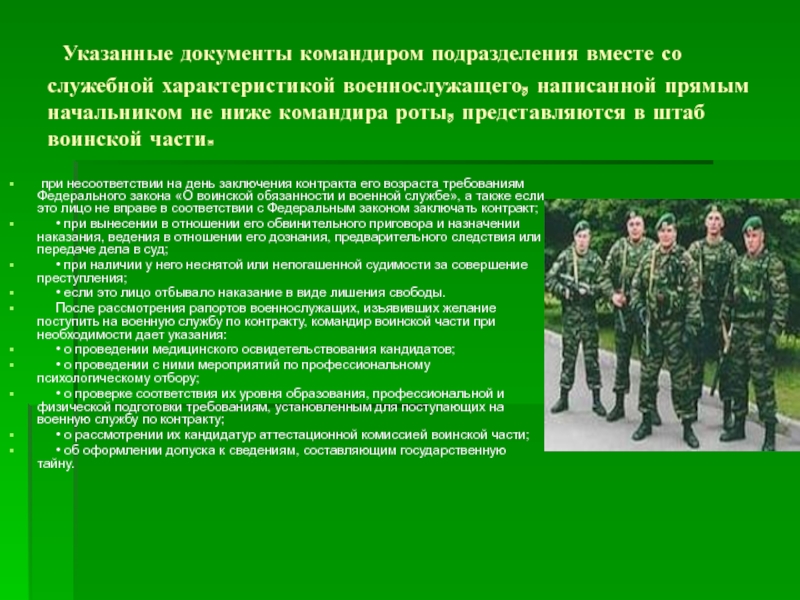 После рассмотрения рапортов военнослужащих, изъявивших желание поступить на военную службу по контракту, командир воинской части при необходимости дает указания: