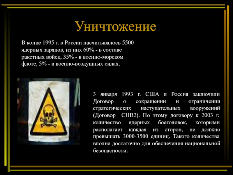 В конце 1995 г. в России насчитывалось 5500 ядерных зарядов, из них 60% - в составе ракетных войск, 35% - в военно-морском флоте, 5% - в военно-воздушных силах.