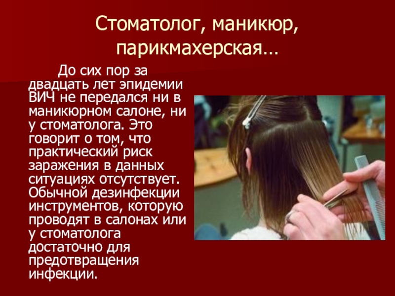 двадцать лет эпидемии ВИЧ не передался ни в маникюрном салоне, ни у стоматолога. Это говорит о том, что практический риск заражения в данных ситуациях отсутствует. Обычной дезинфекции инструментов, которую проводят в салонах или у стоматолога достаточно для предотвращения инфекции.