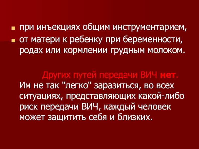 Других путей передачи ВИЧ нет. Им не так "легко" заразиться, во всех ситуациях, представляющих какой-либо риск передачи ВИЧ, каждый человек может защитить себя и близких.