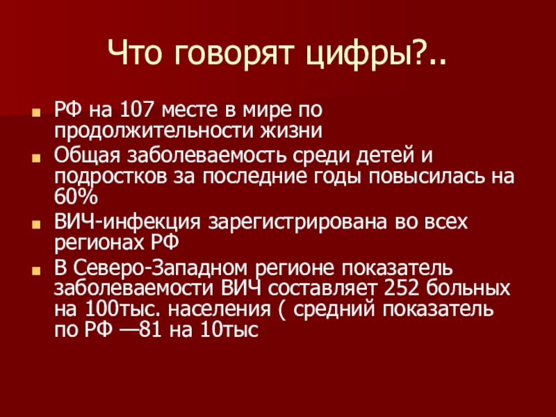 В Северо-Западном регионе показатель заболеваемости ВИЧ составляет 252 больных на 100тыс. населения ( средний показатель по РФ —81 на 10тыс