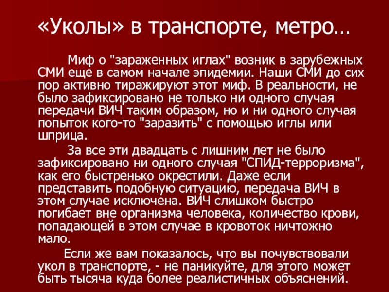 "зараженных иглах" возник в зарубежных СМИ еще в самом начале эпидемии. Наши СМИ до сих пор активно тиражируют этот миф. В реальности, не было зафиксировано не только ни одного случая передачи ВИЧ таким образом, но и ни одного случая попыток кого-то "заразить" с помощью иглы или шприца.