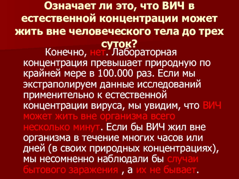 Конечно, нет. Лабораторная концентрация превышает природную по крайней мере в 100.000 раз. Если мы экстраполируем данные исследований применительно к естественной концентрации вируса, мы увидим, что ВИЧ может жить вне организма всего несколько минут. Если бы ВИЧ жил вне организма в течение многих часов или дней (в своих природных концентрациях), мы несомненно наблюдали бы случаи бытового заражения , а их не бывает.
