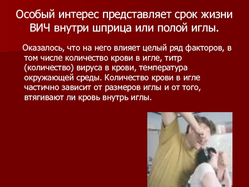 Слайд 16Особый интерес представляет срок жизни ВИЧ внутри шприца или полой иглы.