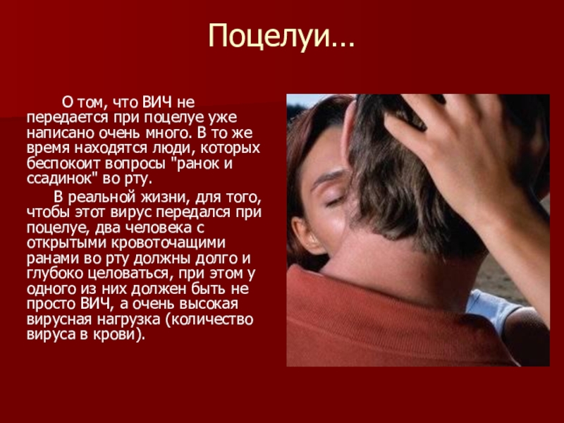 В реальной жизни, для того, чтобы этот вирус передался при поцелуе, два человека с открытыми кровоточащими ранами во рту должны долго и глубоко целоваться, при этом у одного из них должен быть не просто ВИЧ, а очень высокая вирусная нагрузка (количество вируса в крови).