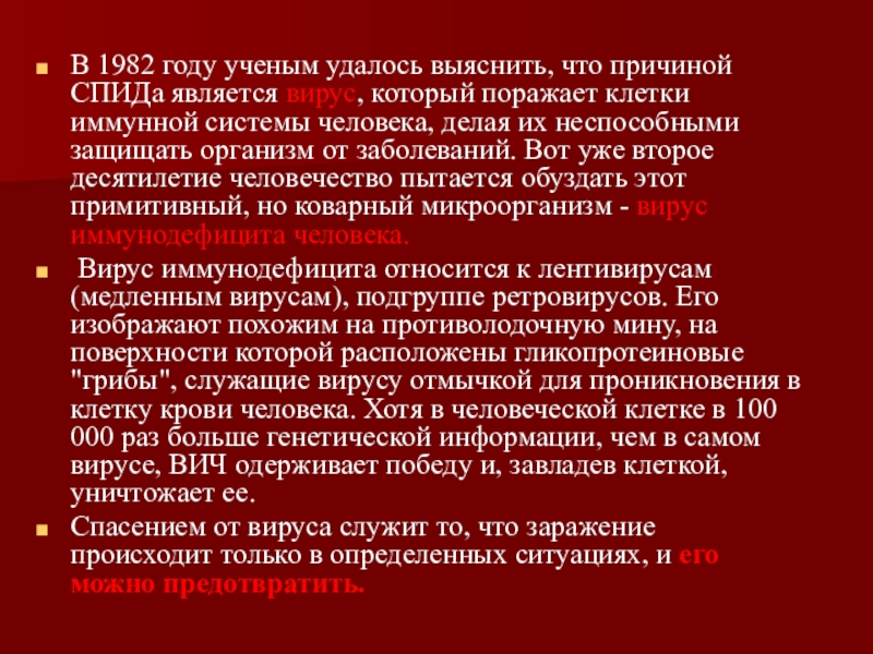 В 1982 году ученым удалось выяснить, что причиной СПИДа является вирус,
