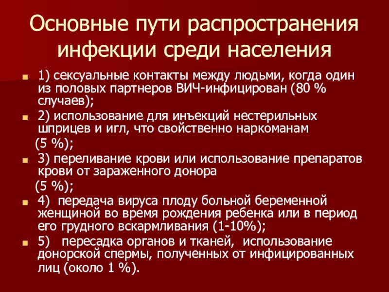 5) пересадка органов и тканей, использование донорской спермы, полученных от инфицированных лиц (около 1 %).