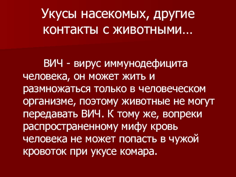 - вирус иммунодефицита человека, он может жить и размножаться только в человеческом организме, поэтому животные не могут передавать ВИЧ. К тому же, вопреки распространенному мифу кровь человека не может попасть в чужой кровоток при укусе комара.
