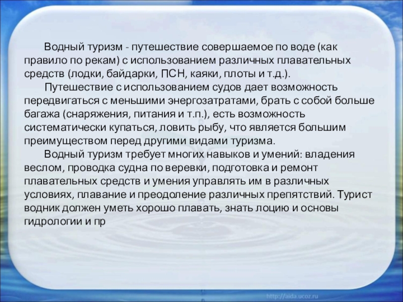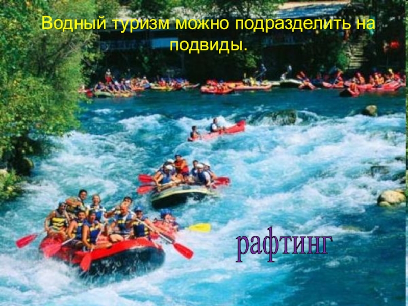 Слайд 12 Водный туризм - путешествие совершаемое по воде (как правило по рекам)