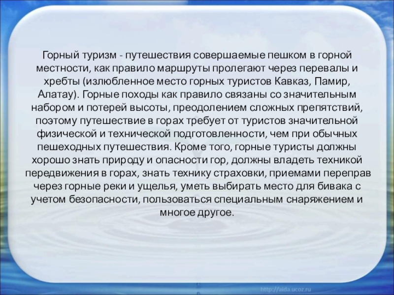 Слайд 10Горный туризм - путешествия совершаемые пешком в горной местности, как правило