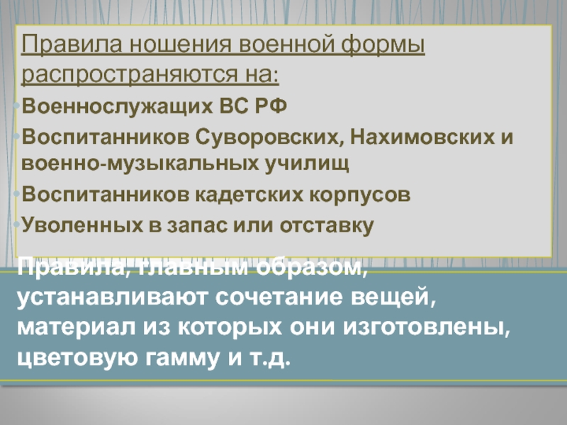 Правила, главным образом, устанавливают сочетание вещей, материал из которых они изготовлены, цветовую гамму и т.д.