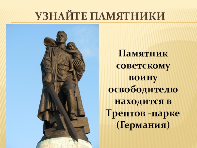Узнайте памятники Памятник советскому воину освободителю находится в Трептов -парке (Германия)