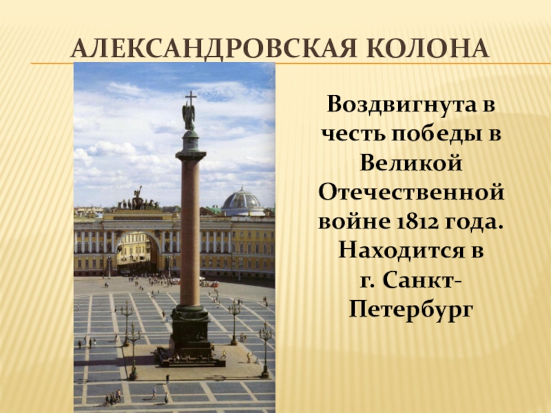 Александровская колонаВоздвигнута в честь победы в Великой Отечественной войне 1812 года. Находится в г. Санкт-Петербург