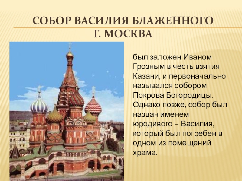 Собор Василия Блаженного г. Москвабыл заложен Иваном Грозным в честь взятия Казани, и первоначально назывался собором Покрова