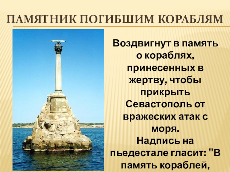 прикрыть Севастополь от вражеских атак с моря. Надпись на пьедестале гласит: "В память кораблей, затопленных в 1854-1855 гг. для заграждения входа на рейд".