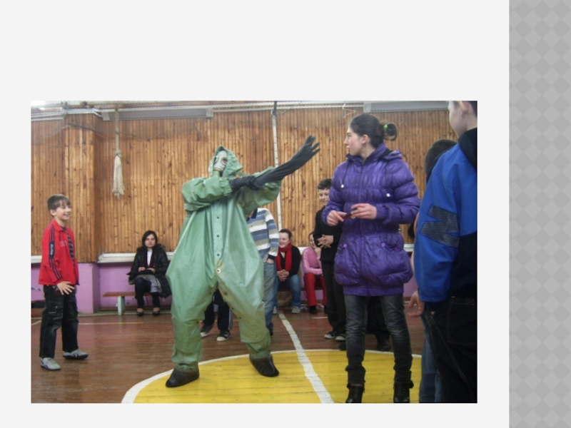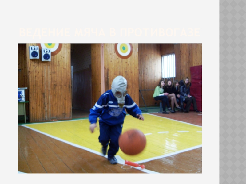 Слайд 9Ведение мяча в противогазе