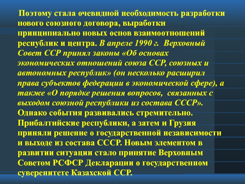 новых основ взаимоотношений республик и центра. В апреле 1990 г. Верховный Совет ССР принял законы «Об основах экономических отношений союза ССР, союзных и автономных республик» (он несколько расширил права субъектов федерации в экономической сфере), а также «О порядке решения вопросов, связанных с выходом союзной республики из состава СССР». Однако события развивались стремительно. Прибалтийские республики, а затем и Грузия приняли решение о государственной независимости и выходе из состава СССР. Новым элементом в развитии ситуации стало принятие Верховным Советом РСФСР Декларации о государственном суверенитете Казахской ССР.