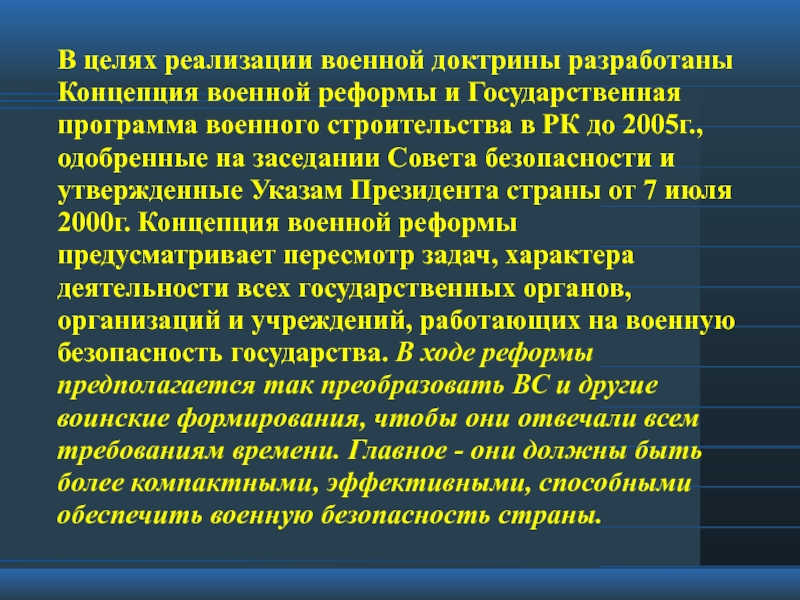 программа военного строительства в РК до 2005г., одобренные на заседании Совета безопасности и утвержденные Указам Президента страны от 7 июля 2000г. Концепция военной реформы предусматривает пересмотр задач, характера деятельности всех государственных органов, организаций и учреждений, работающих на военную безопасность государства. В ходе реформы предполагается так преобразовать ВС и другие воинские формирования, чтобы они отвечали всем требованиям времени. Главное - они должны быть более компактными, эффективными, способными обеспечить военную безопасность страны.