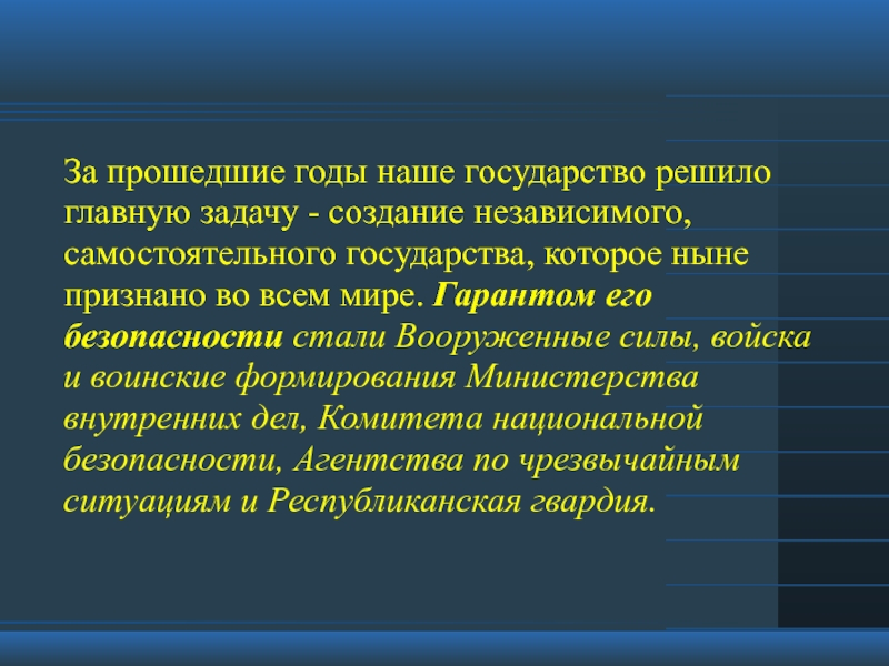 самостоятельного государства, которое ныне признано во всем мире. Гарантом его безопасности стали Вооруженные силы, войска и воинские формирования Министерства внутренних дел, Комитета национальной безопасности, Агентства по чрезвычайным ситуациям и Республиканская гвардия.
