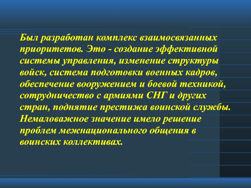изменение структуры войск, система подготовки военных кадров, обеспечение вооружением и боевой техникой, сотрудничество с армиями СНГ и других стран, поднятие престижа воинской службы. Немаловажное значение имело решение проблем межнационального общения в воинских коллективах.