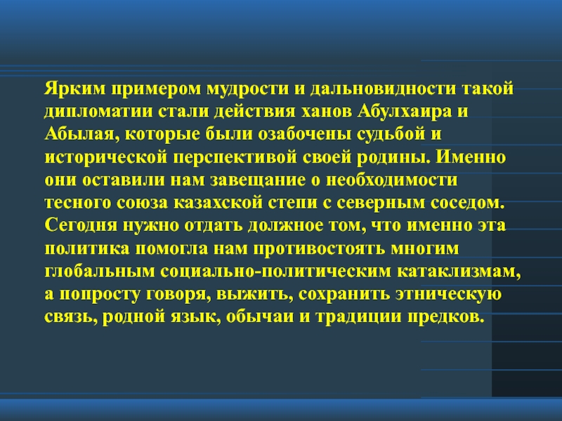 и Абылая, которые были озабочены судьбой и исторической перспективой своей родины. Именно они оставили нам завещание о необходимости тесного союза казахской степи с северным соседом. Сегодня нужно отдать должное том, что именно эта политика помогла нам противостоять многим глобальным социально-политическим катаклизмам, а попросту говоря, выжить, сохранить этническую связь, родной язык, обычаи и традиции предков.