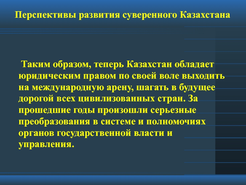 по своей воле выходить на международную арену, шагать в будущее дорогой всех цивилизованных стран. За прошедшие годы произошли серьезные преобразования в системе и полномочиях органов государственной власти и управления.