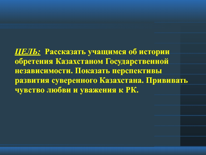 Слайд 2ЦЕЛЬ: Рассказать учащимся об истории обретения Казахстаном Государственной независимости. Показать перспективы