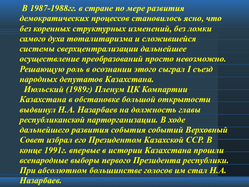 Июльский (1989г) Пленум ЦК Компартии Казахстана в обстановке большой открытости выдвинул Н.А. Назарбаев на должность главы республиканской парторганизации. В ходе дальнейшего развития события событий Верховный Совет избрал его Президентом Казахской ССР. В конце 1991г. впервые в истории Казахстана прошли всенародные выборы первого Президента республики. При абсолютном большинстве голосов им стал Н.А. Назарбаев.