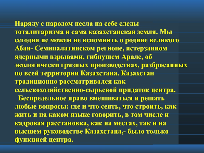 земля. Мы сегодня не можем не вспомнить о родине великого Абая- Семипалатинском регионе, истерзанном ядерными взрывами, гибнущем Арале, об экологически грязных производствах, разбросанных по всей территории Казахстана. Казахстан традиционно рассматривался как сельскохозяйственно-сырьевой придаток центра.