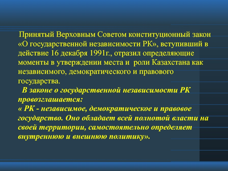 в действие 16 декабря 1991г., отразил определяющие моменты в утверждении места и роли Казахстана как независимого, демократического и правового государства.
