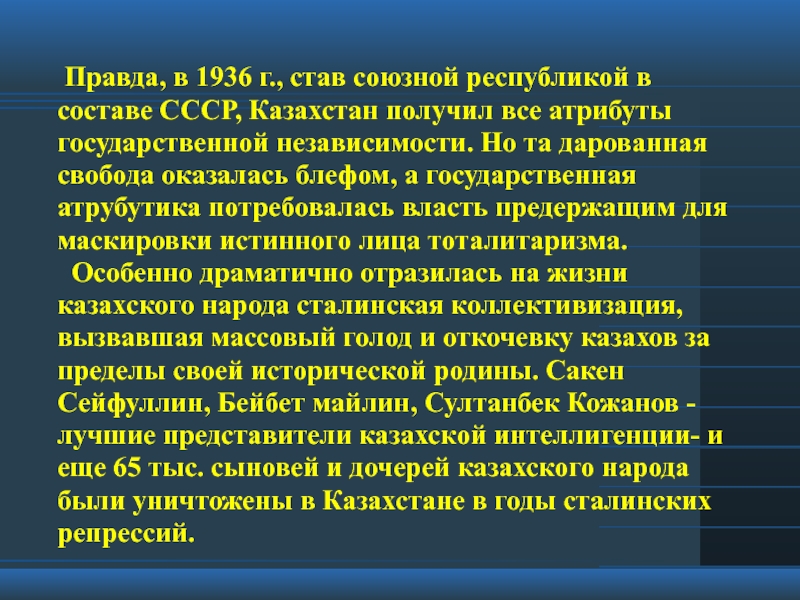 Особенно драматично отразилась на жизни казахского народа сталинская коллективизация, вызвавшая массовый голод и откочевку казахов за пределы своей исторической родины. Сакен Сейфуллин, Бейбет майлин, Султанбек Кожанов - лучшие представители казахской интеллигенции- и еще 65 тыс. сыновей и дочерей казахского народа были уничтожены в Казахстане в годы сталинских репрессий.