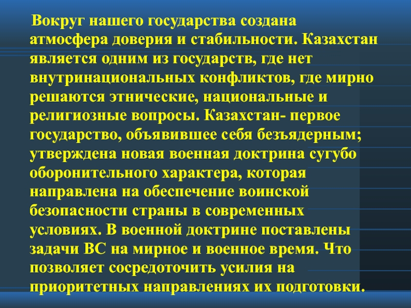 одним из государств, где нет внутринациональных конфликтов, где мирно решаются этнические, национальные и религиозные вопросы. Казахстан- первое государство, объявившее себя безъядерным; утверждена новая военная доктрина сугубо оборонительного характера, которая направлена на обеспечение воинской безопасности страны в современных условиях. В военной доктрине поставлены задачи ВС на мирное и военное время. Что позволяет сосредоточить усилия на приоритетных направлениях их подготовки.