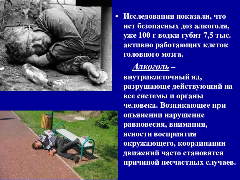 Алкоголь – внутриклеточный яд, разрушающе действующий на все системы и органы человека. Возникающее при опьянении нарушение равновесия, внимания, ясности восприятия окружающего, координации движений часто становятся причиной несчастных случаев.