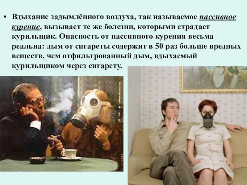 Вдыхание задымлённого воздуха, так называемое пассивное курение, вызывает те же болезни,