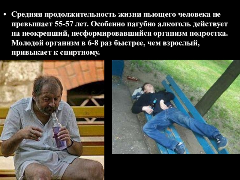 Средняя продолжительность жизни пьющего человека не превышает 55-57 лет. Особенно пагубно
