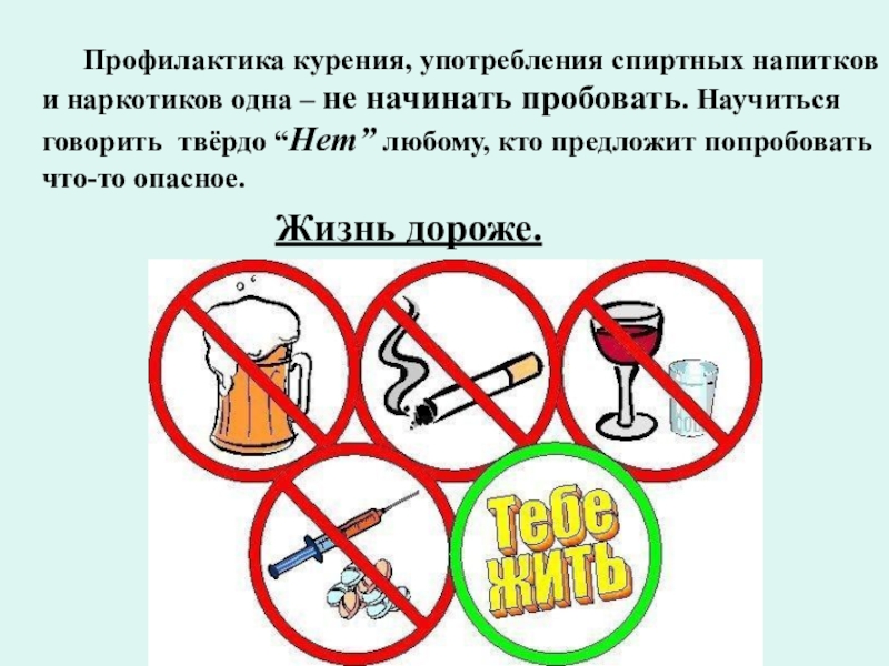 наркотиков одна – не начинать пробовать. Научиться говорить твёрдо “Нет” любому, кто предложит попробовать что-то опасное.