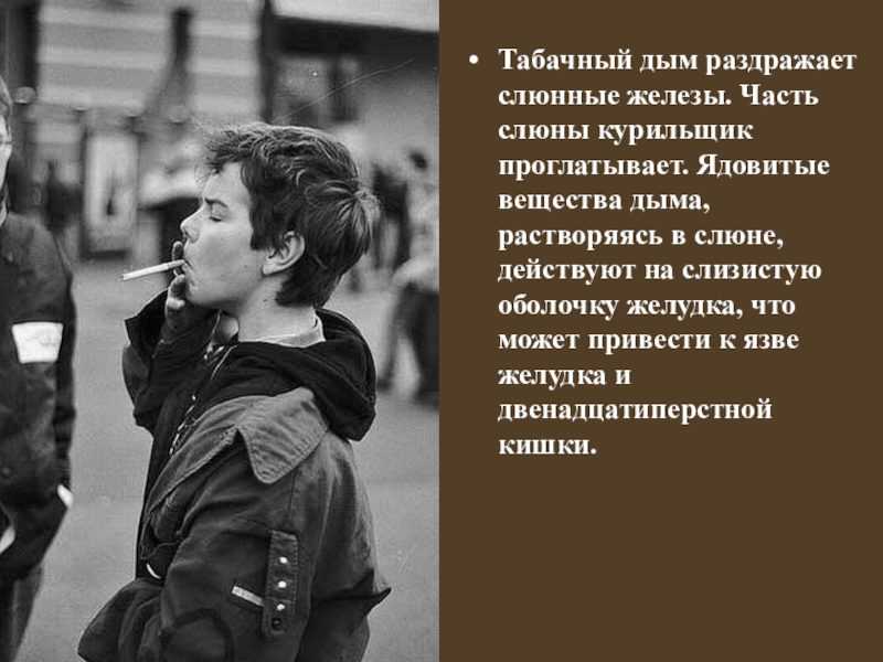 Табачный дым раздражает слюнные железы. Часть слюны курильщик проглатывает. Ядовитые вещества