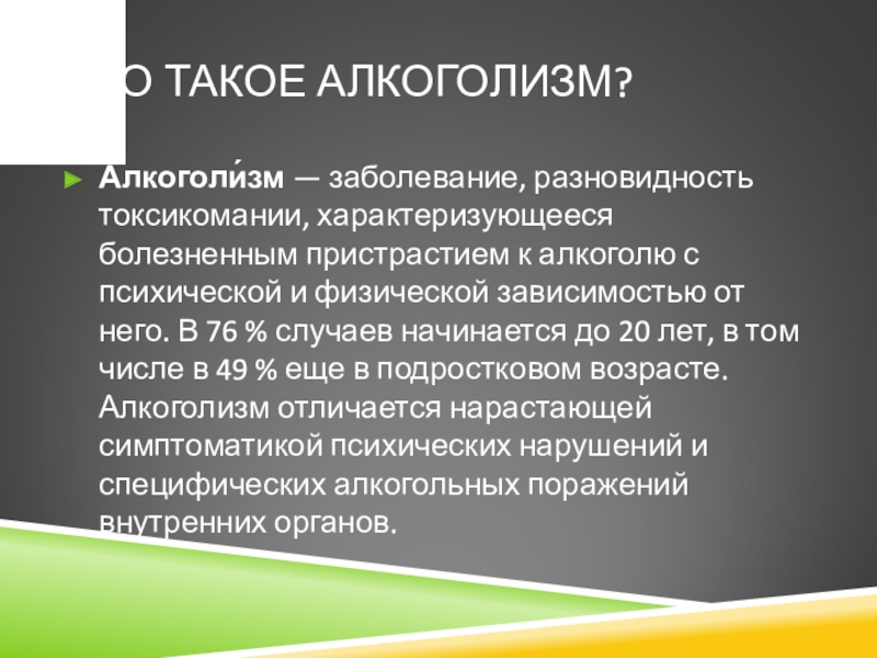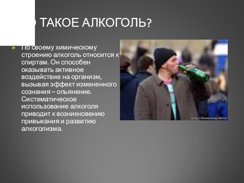 Слайд 4ЧТО ТАКОЕ АЛКОГОЛИЗМ?