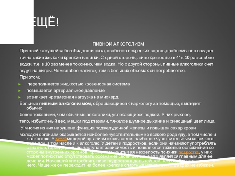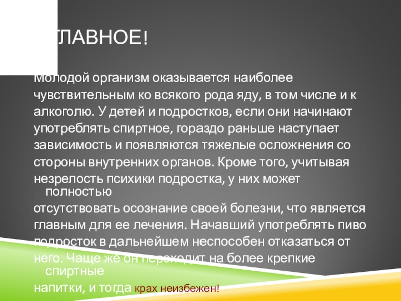 молодой организм оказывается наиболее чувствительным ко всякого рода яду, в том числе и к алкоголю. У детеймолодой организм оказывается наиболее чувствительным ко всякого рода яду, в том числе и к алкоголю. У детей и подростков, если они начинают употреблять спиртное, гораздо раньше наступает зависимость и появляются тяжелые осложнения со стороны внутренних органов. Кроме того, учитывая незрелость психики подростка, у них может полностью отсутствовать осознание своей болезни, что является главным для ее лечения. Начавший употреблять пиво подросток в дальнейшем неспособен отказаться от него. Чаще же он переходит на более крепкие спиртные напитки, и тогда крах неизбежен.